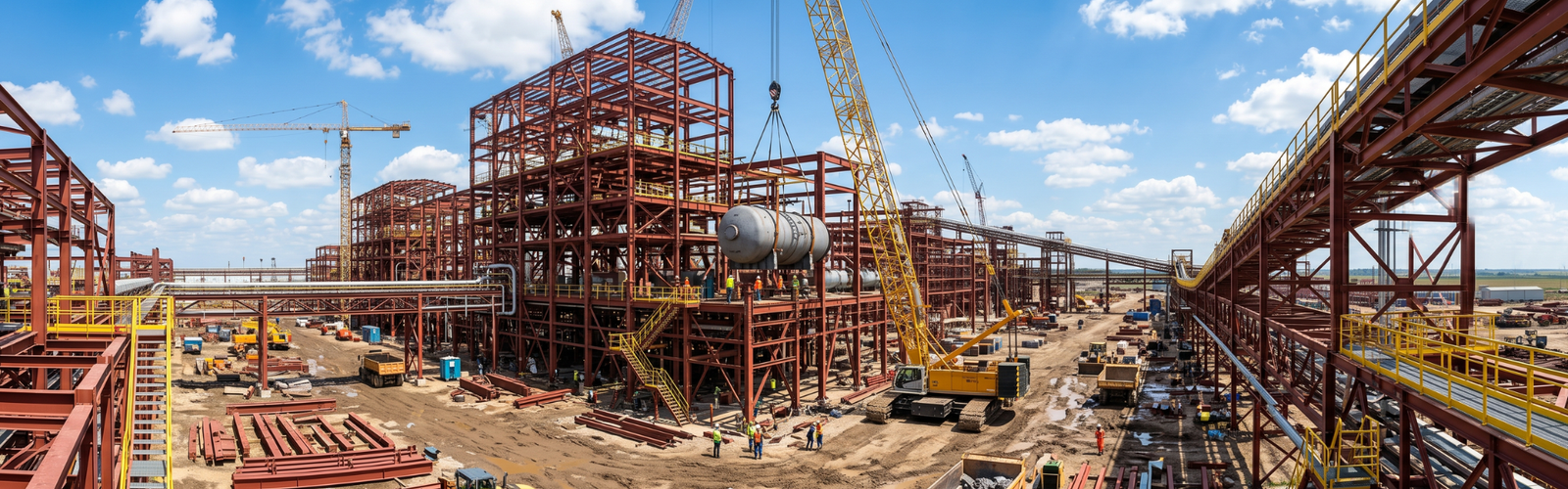 Technological structure erection involves the assembly and installation of complex structural systems that are essential to industrial production. These include equipment foundations, machinery support structures, load-bearing components, supports for wear-prone parts, and suspended systems for moving elements such as gears, motors, and bearings.